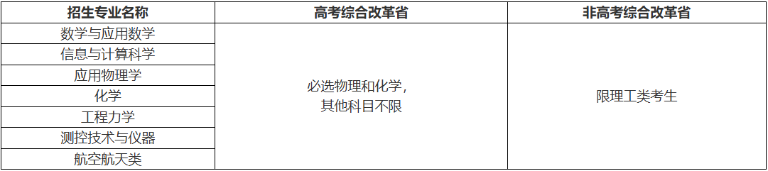 我校围绕数学与应用数学、信息与计算科学、应用物理学、化学、工程力学、测控技术与仪器、航空航天类等专业设置2025年强基计划招生专业及对应培养方向。符合报名条件的考生在各省(区、市)可填报的招生专业和招生计划以我校强基计划报名系统公布为准。